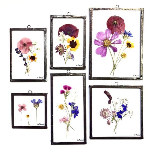 Zoals je gewend bent van By Manoa zijn de lijstjes van begin tot eind met de hand gemaakt. Het glas is op maat gesneden, de bloemen zijn zelf geplukt en gedroogd in een bloemenpers. Het lijstje wat er om heen zit is ook met de hand gemaakt. Het materiaal dat er om heen zit is een soort metaal dat gesoldeerd is en een oudere look heeft door een speciale manier van bewerken.