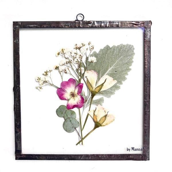 Zoals je gewend bent van By Manoa zijn de lijsten van begin tot eind met de hand gemaakt. Het glas is op maat gesneden, de bloemen zijn zelf geplukt en gedroogd in een bloemenpers. De rand van de lijst is ook met de hand gemaakt. Het materiaal dat er om heen zit is een soort metaal dat gesoldeerd is en een oudere look heeft door een speciale manier van bewerken.