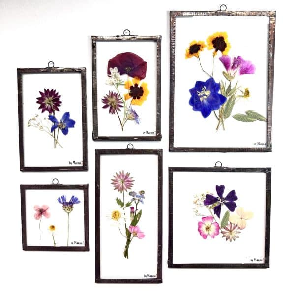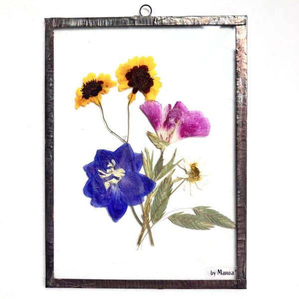Zoals je gewend bent van By Manoa zijn de lijsten van begin tot eind met de hand gemaakt. Het glas is op maat gesneden, de bloemen zijn zelf geplukt en gedroogd in een bloemenpers. De lijst wat er om heen zit is ook met de hand gemaakt. Het materiaal dat er om heen zit is een soort metaal dat gesoldeerd is en een oudere look heeft door een speciale manier van bewerken.