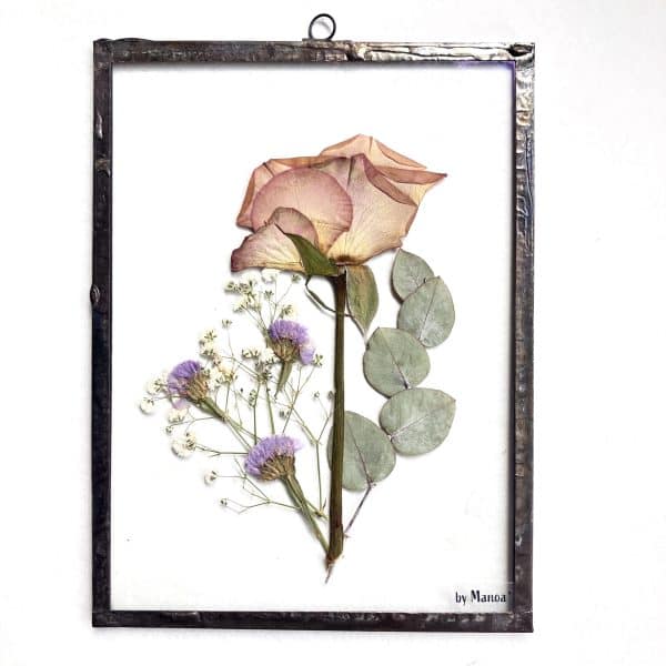 Zoals je gewend bent van By Manoa zijn de lijsten van begin tot eind met de hand gemaakt. Het glas is op maat gesneden, de bloemen zijn zelf geplukt en gedroogd in een bloemenpers. De lijst wat er om heen zit is ook met de hand gemaakt. Het materiaal dat er om heen zit is een soort metaal dat gesoldeerd is en een oudere look heeft door een speciale manier van bewerken.