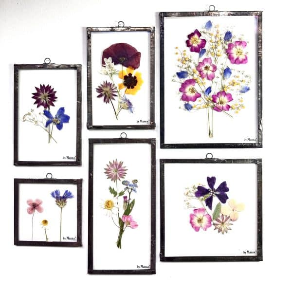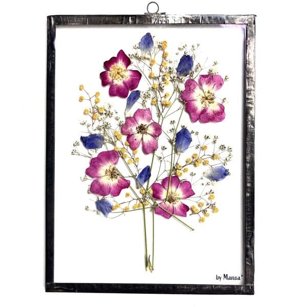 Zoals je gewend bent van By Manoa zijn de lijsten van begin tot eind met de hand gemaakt. Het glas is op maat gesneden, de bloemen zijn zelf geplukt en gedroogd in een bloemenpers. De lijst wat er om heen zit is ook met de hand gemaakt. Het materiaal dat er om heen zit is een soort metaal dat gesoldeerd is en een oudere look heeft door een speciale manier van bewerken.