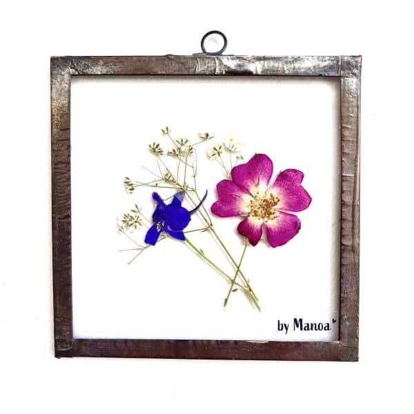 Zoals je gewend bent van By Manoa zijn de lijstjes van begin tot eind met de hand gemaakt. Het glas is op maat gesneden, de bloemen zijn zelf geplukt en gedroogd in een bloemenpers. Het lijstje wat er om heen zit is ook met de hand gemaakt. Het materiaal dat er om heen zit is een soort metaal dat gesoldeerd is en een oudere look heeft door een speciale manier van bewerken.