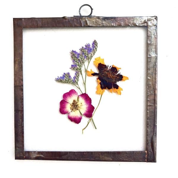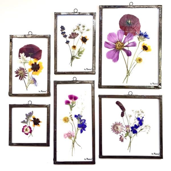 Zoals je gewend bent van By Manoa zijn de lijstjes van begin tot eind met de hand gemaakt. Het glas is op maat gesneden, de bloemen zijn zelf geplukt en gedroogd in een bloemenpers. Het lijstje wat er om heen zit is ook met de hand gemaakt. Het materiaal dat er om heen zit is een soort metaal dat gesoldeerd is en een oudere look heeft door een speciale manier van bewerken.